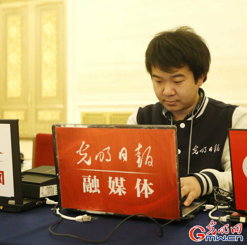 光明日报融媒体记者在总理记者会上的直播区进行炫融直播。(光明网记者孙佳涵 摄)